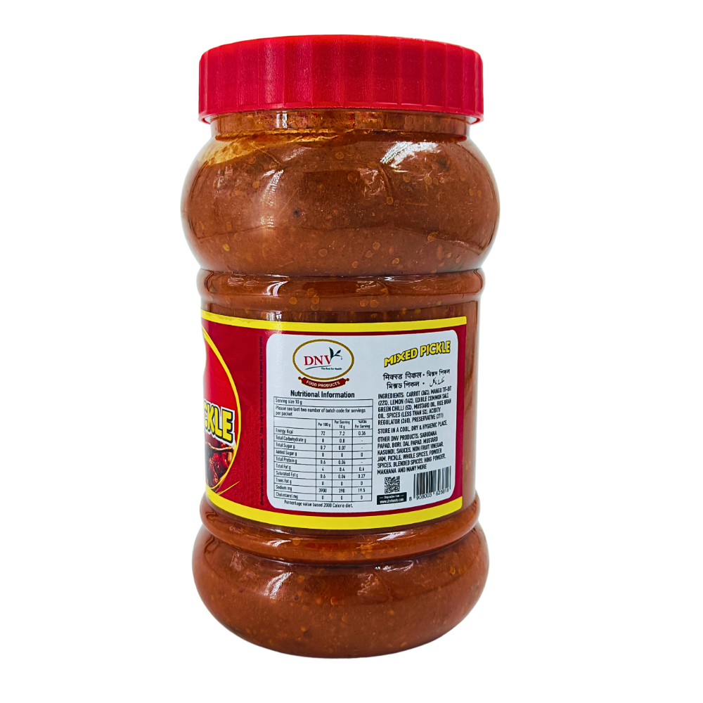 DNV Mixed Pickle 1KG Jar – Tangy and spicy mixed pickle made from premium-quality vegetables and fruits. Perfect accompaniment to meals, adding a burst of flavor to rice, parathas, and snacks. Freshly packed for long-lasting taste.