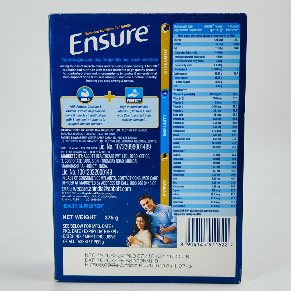 Ensure V 400 g is a nutritious health drink designed to support overall wellness. Enriched with essential vitamins, minerals, and protein, it helps maintain strength, energy, and immunity for adults of all ages.