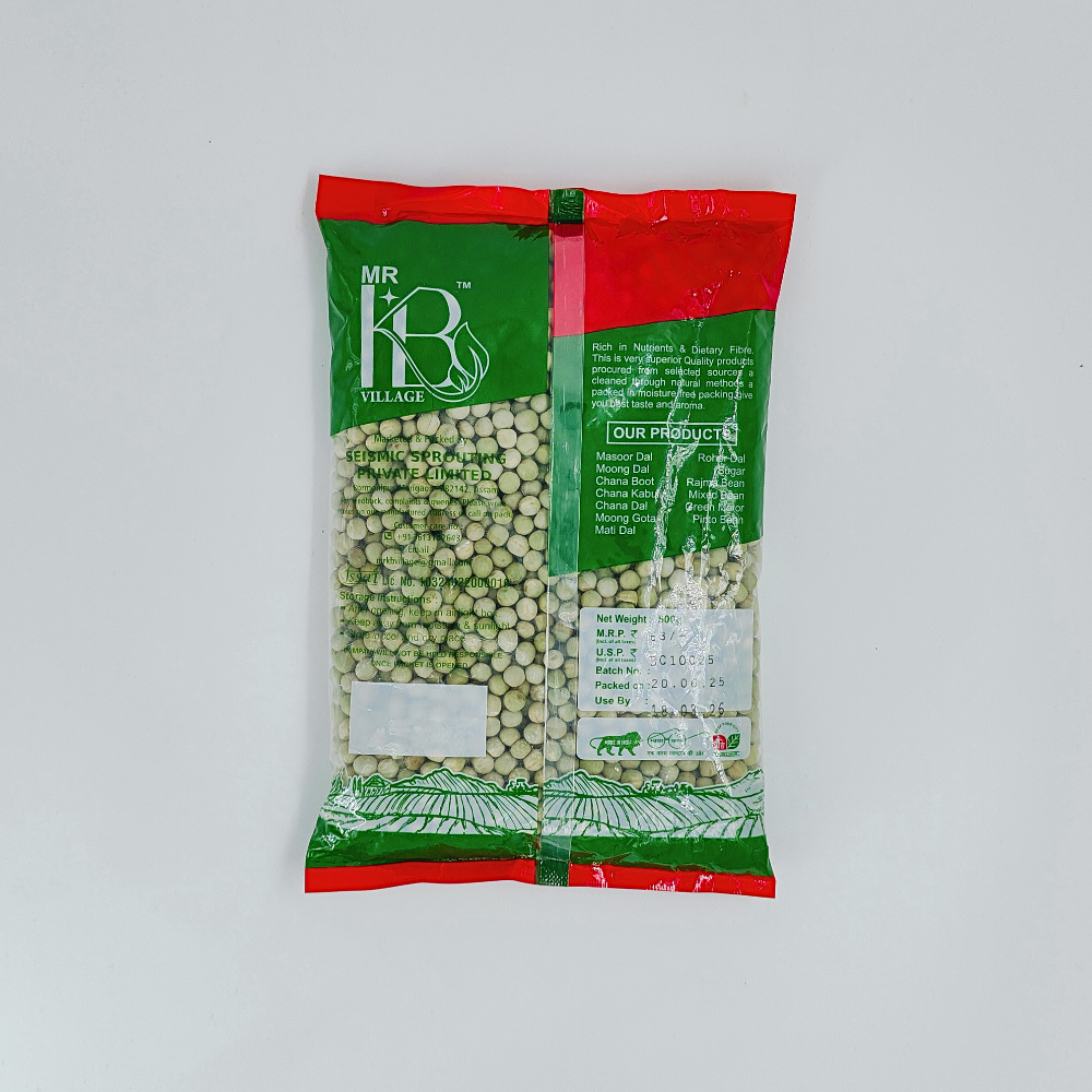 MR KB Green Matar 500GM – Premium quality green peas, rich in protein, fiber, and nutrients. Ideal for curries, snacks, and rice dishes. Freshly packed to retain natural taste, texture, and long-lasting freshness.