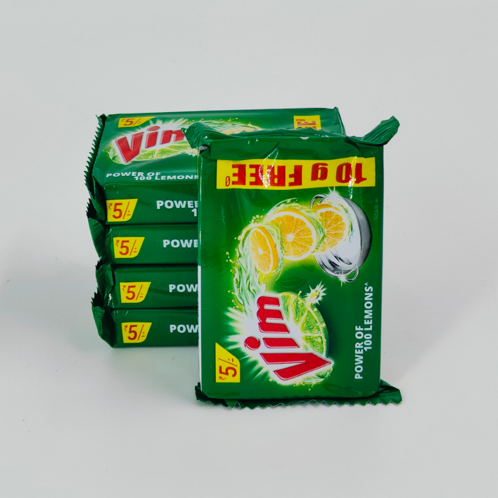 Vim Bar 5/- (60+10gm) brings powerful lemon freshness in a small, value pack. Its extra 10gm offers more cleaning for the same price. Tough on grease yet gentle on hands, it easily removes stains and leaves utensils sparkling clean and fragrant. Perfect for daily kitchen use.
